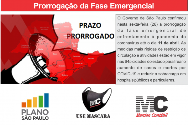 O Governo de São Paulo confirmou nesta sexta-feira (26) através de entrevista coletiva a prorrogação da fase emergencial de enfrentamento à pandemia do coronavírus até o dia 11 de abril. As medidas mais rígidas de restrição de circulação e atividades estão em vigor nas 645 cidades do estado para frear o aumento de casos e mortes por COVID-19 e reduzir a sobrecarga em hospitais públicos e particulares.
